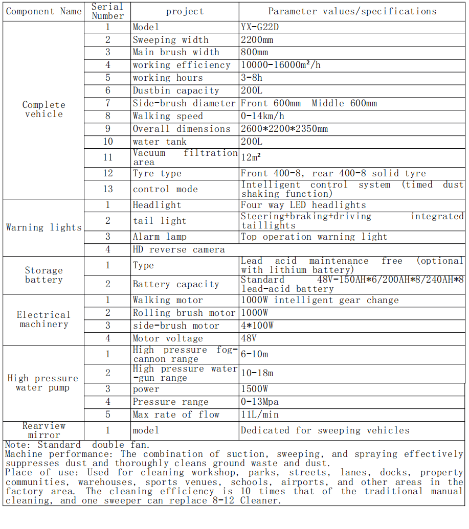 Tempat Pemakaian : Digunakan untuk pembersihan bengkel, taman, jalan, jalur, dermaga, properti komunitas, gudang, tempat olah raga, sekolah, bandara, dan area lain di area pabrik. Efisiensi pembersihannya 10 kali lipat dibandingkan pembersihan manual tradisional, dan satu penyapu dapat menggantikan 8-12 Pembersih.
