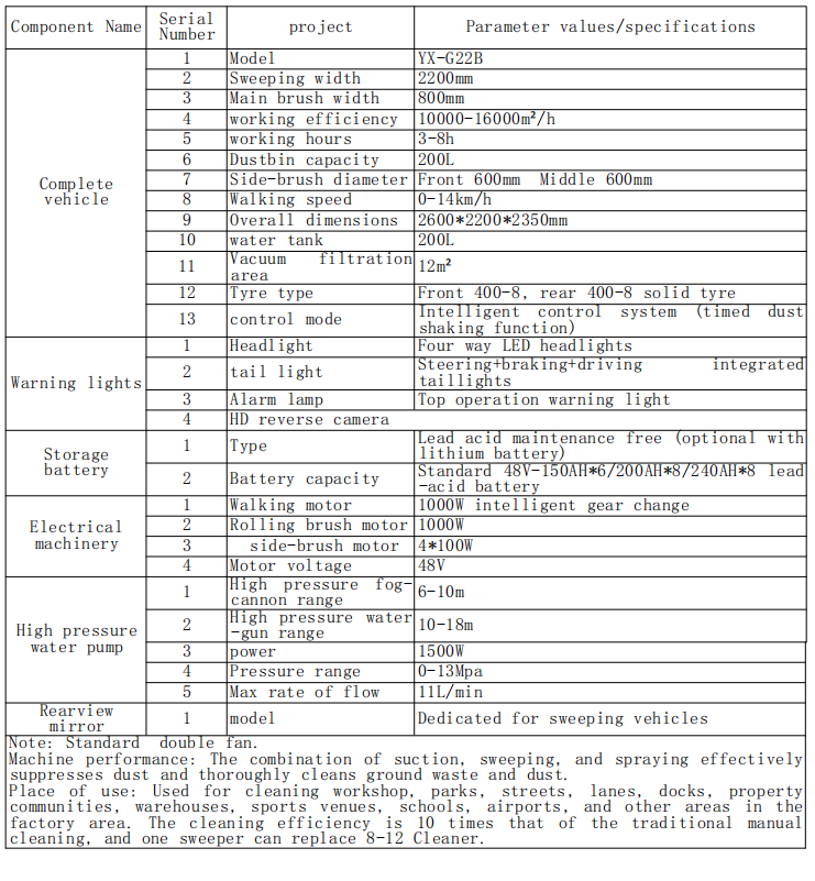 Tempat Pemakaian : Digunakan untuk pembersihan bengkel, taman, jalan, jalur, dermaga, properti komunitas, gudang, tempat olah raga, sekolah, bandara, dan area lain di area pabrik. Efisiensi pembersihannya 10 kali lipat dibandingkan pembersihan manual tradisional, dan satu penyapu dapat menggantikan 8-12 Pembersih.