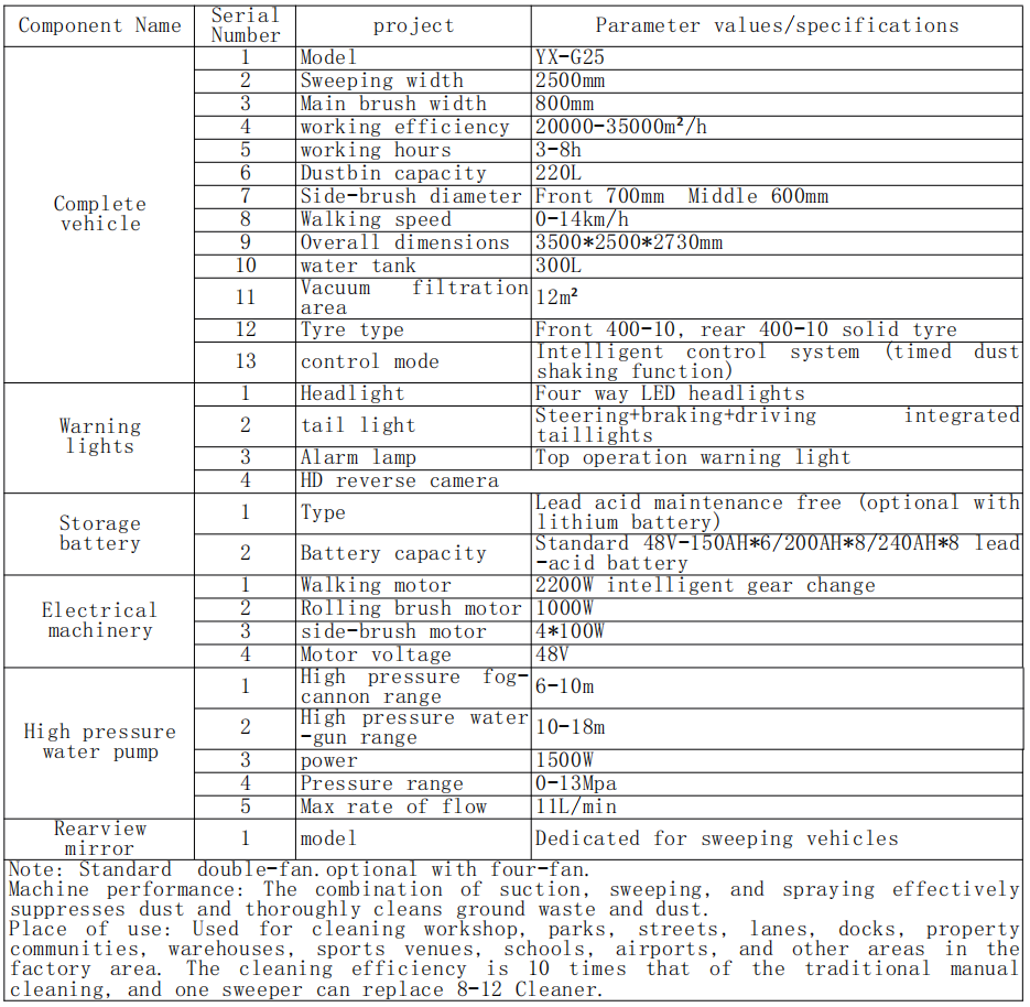 Tempat Pemakaian : Digunakan untuk pembersihan bengkel, taman, jalan, jalur, dermaga, properti komunitas, gudang, tempat olah raga, sekolah, bandara, dan area lain di area pabrik. Efisiensi pembersihannya 10 kali lipat dibandingkan pembersihan manual tradisional, dan satu penyapu dapat menggantikan 8-12 Pembersih.
