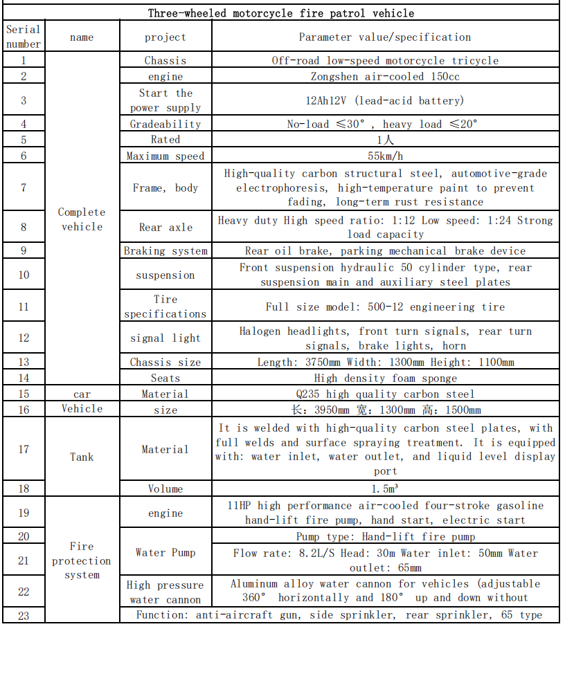 Mengingat rendahnya kualitas jalan pedesaan dan jauhnya jarak dari stasiun pemadam kebakaran, sepeda motor pemadam kebakaran roda tiga dapat digunakan sebagai perlengkapan utama pemadam kebakaran profesional kota. Mereka dapat membawa lebih banyak perbekalan dibandingkan kendaraan roda dua dan lebih mudah beradaptasi terhadap kondisi jalan yang kompleks dibandingkan truk pemadam kebakaran roda empat, sehingga mewujudkan "pengiriman polisi terdekat dan pembuangan yang cepat."