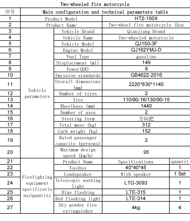 Sepeda motor pemadam kebakaran segala medan ini memiliki performa off-road yang sangat baik. Ia dapat dengan cepat dan fleksibel melakukan pemadaman kebakaran dan penyelamatan di jalan pegunungan yang terjal atau jalan sempit. Jika terjadi bahaya kebakaran mendadak, dapat membawa 3 orang untuk membentuk tim tempur untuk memadamkan sumber api.